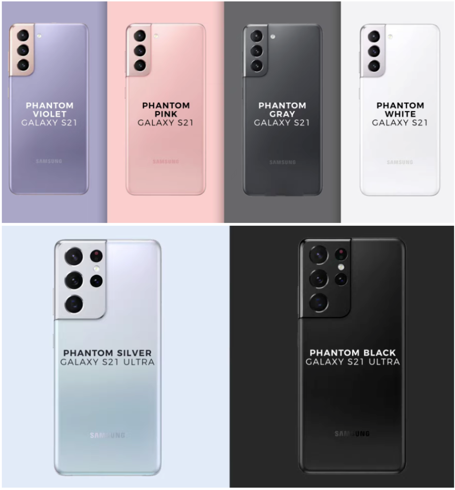 순서대로 갤럭시 S21의 팬텀 바이올렛 / 팬텀 핑크 / 팬텀 그레이 / 팬텀 화이트